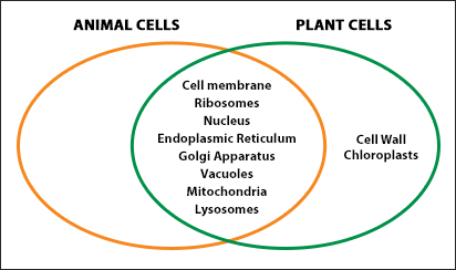 Now look at the Venn diagram that compares and contrasts plant and animal cells. Think about the cross-sectional cell diagram above. Both are explanations of the same concepts but use different approaches to visually explain the information.